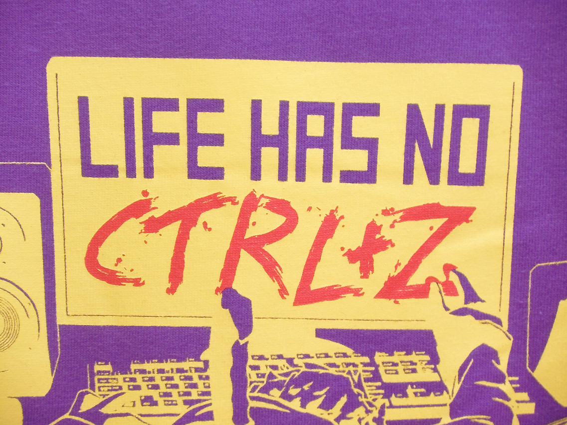 人生一度きり、巻き戻しはできないぜ。それはデジタルに耽溺した現代人が忘れがちなこと。特に、なんでもキーボードのショートカット「CTRL+Z」(Undo)でやり直ししちゃう君!この警告が書かれたTシャツを着て、自戒しなさい!必ずだぞ!