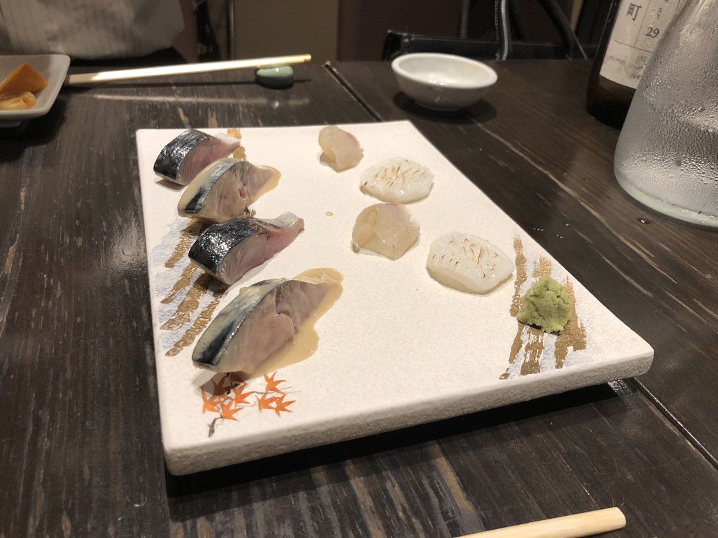 お次は刺し身三種・・・・またスッゲぇのがきたー!!!全てが最高でしたが、特に〆鯖。ゴマクリームで味付けしたのと、そうじゃないのを食べ比べられるという贅沢なつくり。もー、この時点で僕のハートは撃ち抜かれましたね。