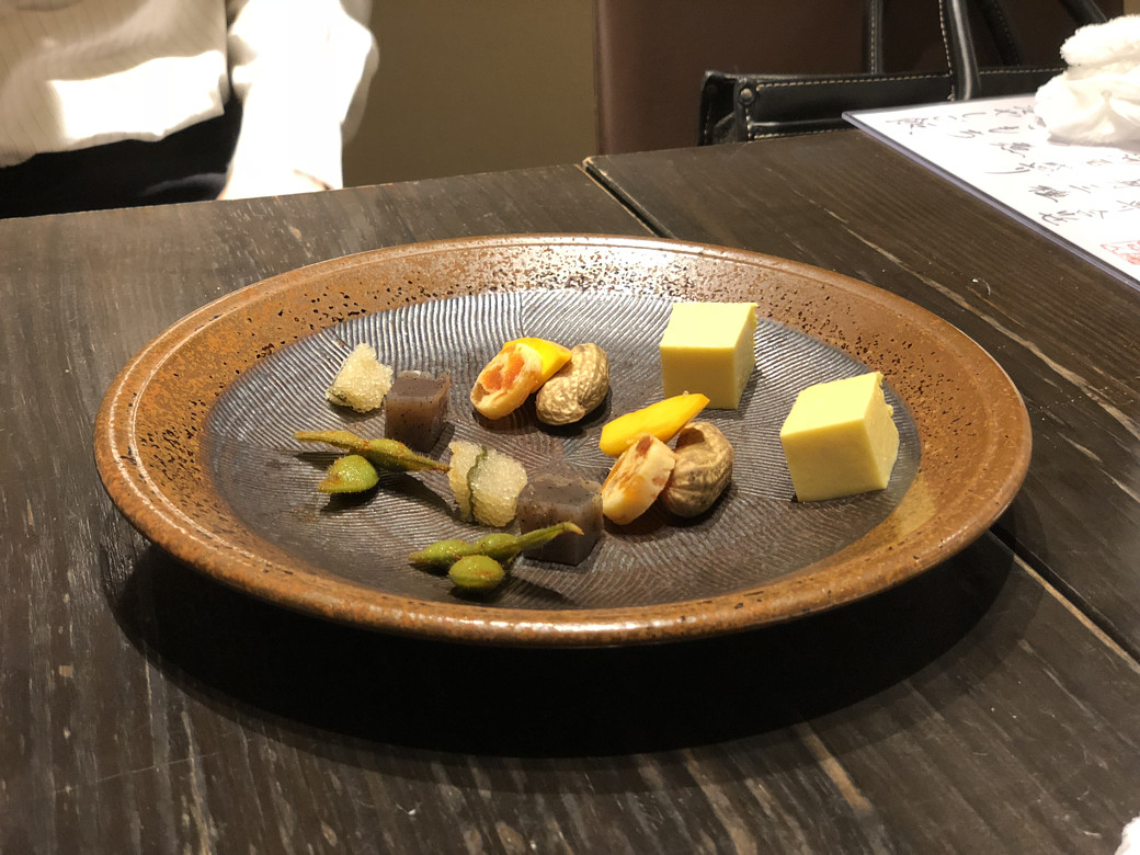 まずは前菜である前菜盛り合わせからですが・・・お、オシャレ~~~!!??合計7品もの前菜が、少しづつ優雅に並べられています。いきなりのインパクト。これで僕のテンションは青天井でした!しかも味が凝ってるんだわ。枝豆だって特別な味付けがされていたし、落花生なんて蒸して?あってホンニャリと不思議な食感が楽しめる!