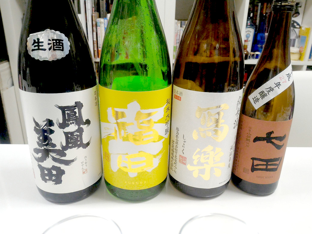 ①「鳳凰美田 純米大吟醸 本生」精米歩合50% アルコール度16~17%日本酒度±0 酸度1.5アミノ酸度:非公開 酵母:自社培養②「福田 純米大吟醸 幸 1回火入れ」精米歩合50% アルコール度16%日本酒度-2 酸度1.7アミノ酸度:非公開 酵母:1401③「冩楽 純米 1回火入れ」精米歩合60% アルコール度16%日本酒度+2 酸度1.4アミノ酸度:非公開 酵母:F701④「七田 七割五分磨き 無濾過 H27BY」精米歩合75% アルコール度17%日本酒度+4.5 酸度1.7アミノ酸度:非公開 酵母:佐賀9号