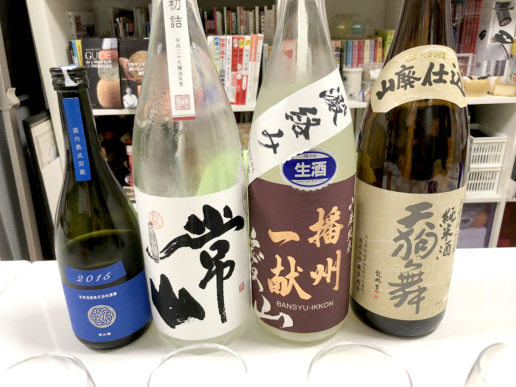 ①新政 ラピス2015別誂蔵内熟成精米歩合 麹米40% 掛米50%アルコール度 15%日本酒度 ±0酸度 1.8アミノ酸度 0.6酵母 6号(新政酵母)②常山 槽場初詰 別誂精米歩合 麹米50% 掛米60%アルコール度 16.3%日本酒度 +2酸度 1.8アミノ酸度 1.2酵母 FK-501&K1901③播州一献 山廃純米愛山 澱絡み生精米歩合 65%アルコール度 16%日本酒度 +4酸度 1.8アミノ酸度 0.9酵母 K701④天狗舞 山廃純米精米歩合 60%アルコール度 15.9%日本酒度 +3酸度 1.8アミノ酸度 2.0酵母 自社培養