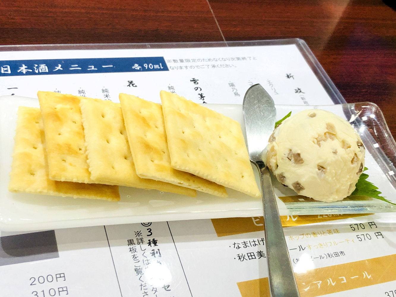 新幹線の待ち時間にサクッと一杯飲むのに特化したメニューになっていて、お酒は10種類ぐらい、地ビール2種、おつまみ5~7種ぐらいと絞られた構成になっています。しかし、これがいい。種類は少ないけど人気どころばかりで秋田酒飲みたい!というニーズにクリーンヒットする感じです。