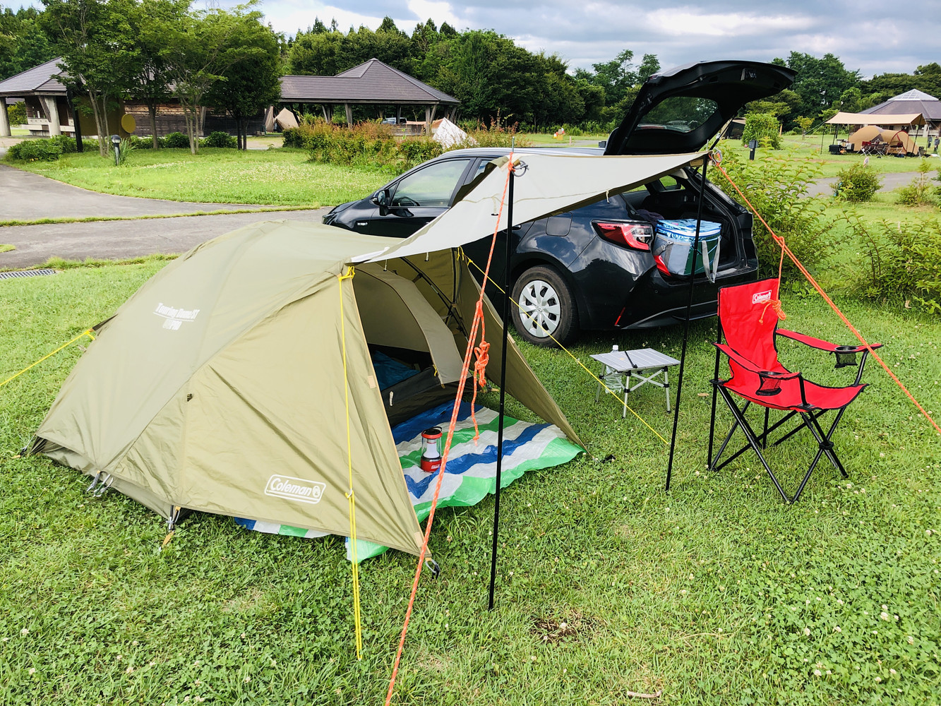 テキパキと設営する。なんとキャンプ場のご厚意で普通のサイトからオートキャンプサイトにアップグレードしてもらいました。車止められないサイトは利用者が僕以外いないからだそうで。真夏のキャンプ場って人がいっぱいいると思ってましたが、そうでもないんですな。